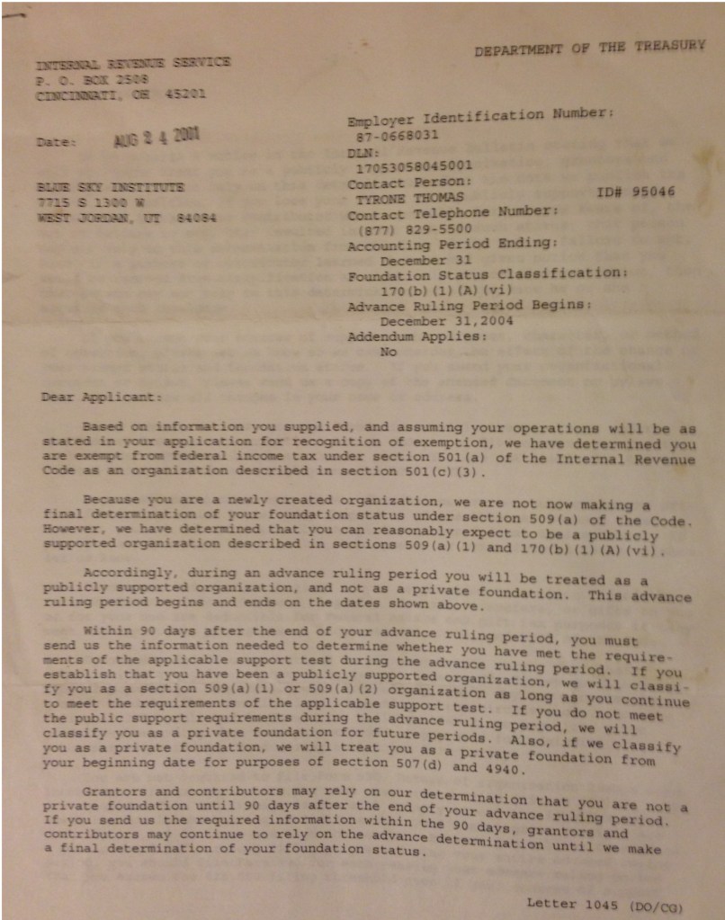 On the Sixteenth of January 2001, the above named Division sent a notice of Incomplete Registration to our office. This notice was received at Blue Sky Institute on the 20th of January 2001. The notice stated in a bold face all caps format the following “YOU MAY NOT USE THE WORD INSTITUTE IN THE CORPORATE NAME” and very little else was written into the “Incomplete Registration” form. Since the founders did not understand the ‘why’ of it, they looked into the “Utah Code” and found out that they were able to use the word “Institute” as part of the corporate name if the “written consent from the Utah State Board of Regents”. was obtained. The “consent” was obtained and the founders were informed that the “Certificate of Registration” had been printed, and Blue Sky Institute has been registered in good standing as a Utah Non-Profit Corporation since.