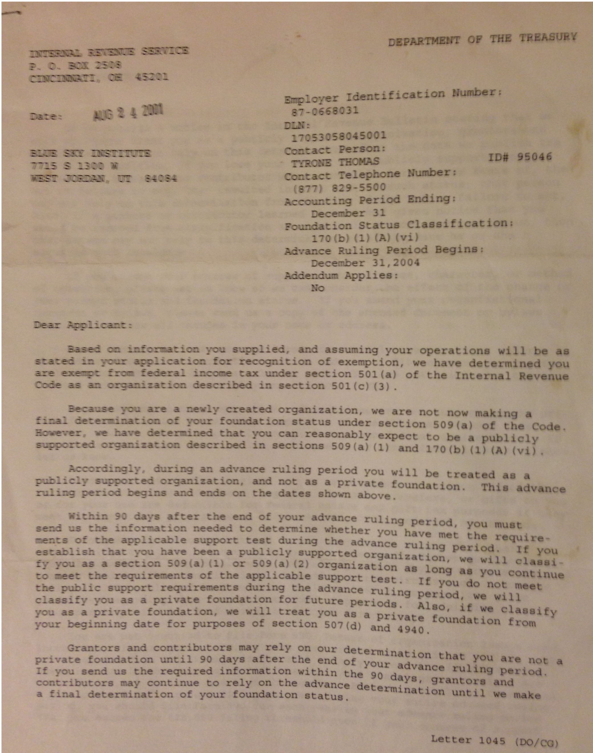 On the Sixteenth of January 2001, the above named Division sent a notice of Incomplete Registration to our office. This notice was received at Blue Sky Institute on the 20th of January 2001. The notice stated in a bold face all caps format the following “YOU MAY NOT USE THE WORD INSTITUTE IN THE CORPORATE NAME” and very little else was written into the “Incomplete Registration” form. Since the founders did not understand the ‘why’ of it, they looked into the “Utah Code” and found out that they were able to use the word “Institute” as part of the corporate name if the “written consent from the Utah State Board of Regents”. was obtained. The “consent” was obtained and the founders were informed that the “Certificate of Registration” had been printed, and Blue Sky Institute has been registered in good standing as a Utah Non-Profit Corporation since.